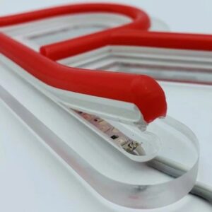 Skaidraus akrilo plokštės, LED juostos, įvairių neono spalvų silikoniniai dangteliai.